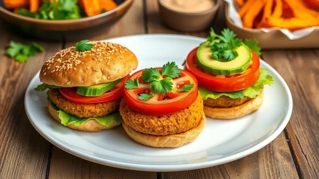 Vegan coconut curry lentil burgers on whole grain buns with toppings, served with sweet potato fries.