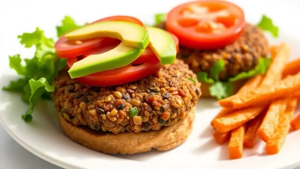Vegan lentil quinoa burgers on whole grain buns with lettuce, tomato, and avocado, served with sweet potato fries.